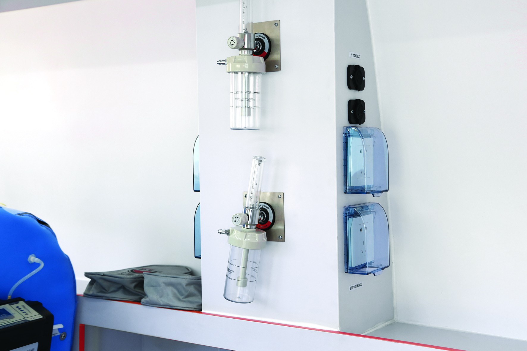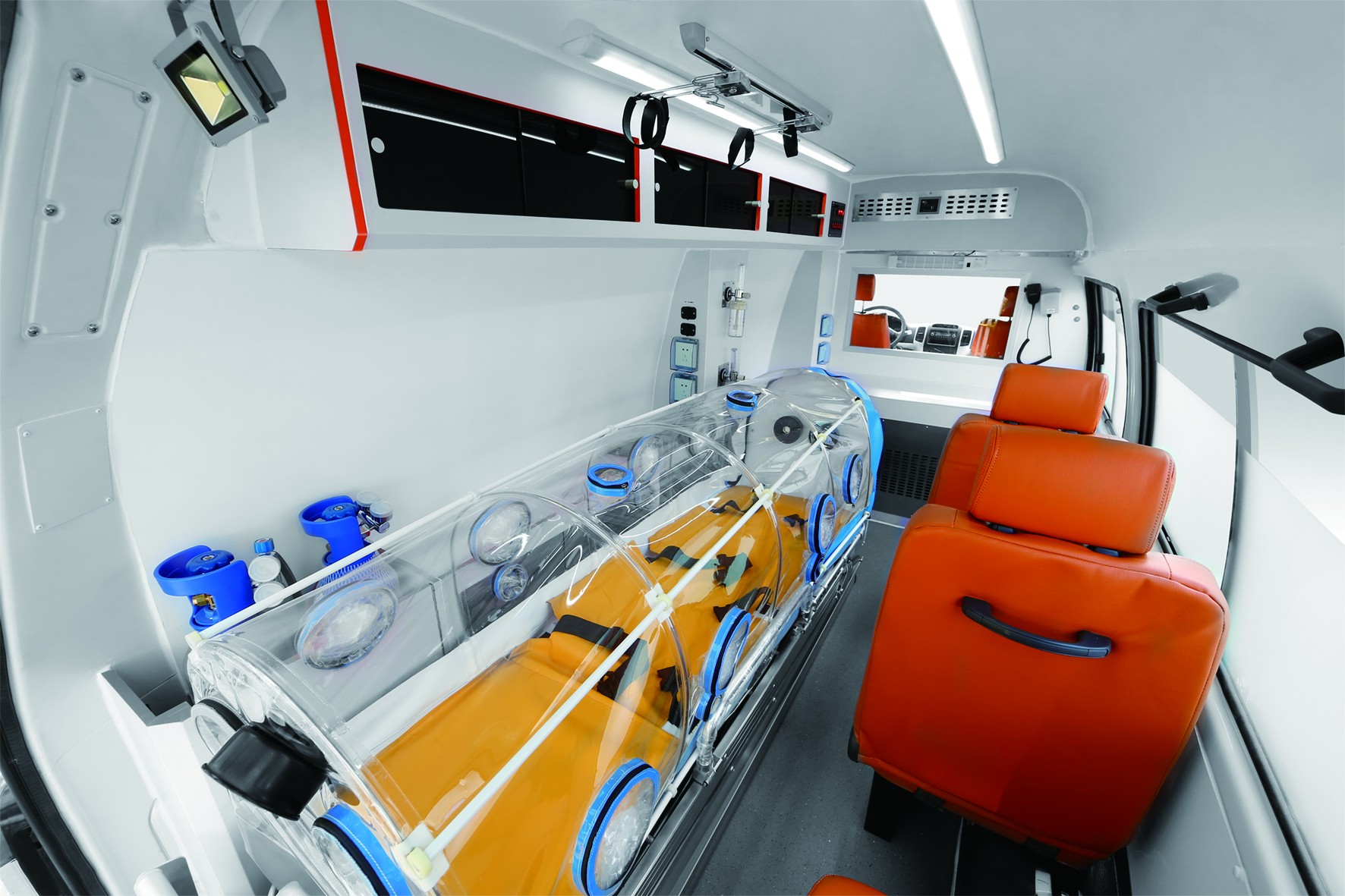 安全性方面,我们在金旅海狮良好的车身底盘的基础上,增加ABS+EBD、倒车系统等主动式安全措施,特别对医疗舱的内饰件进行了安全性和可靠性试验,医疗舱所有柜门采用动态静音式设计,所有柜体边角采用合理式圆弧设计,增加缓冲软包,真正做到在使用过程中不会造成二次伤害。同时在内饰的每一个细节布置的处理上特别强调在行驶过程中,车内医务人员和患者的安全。