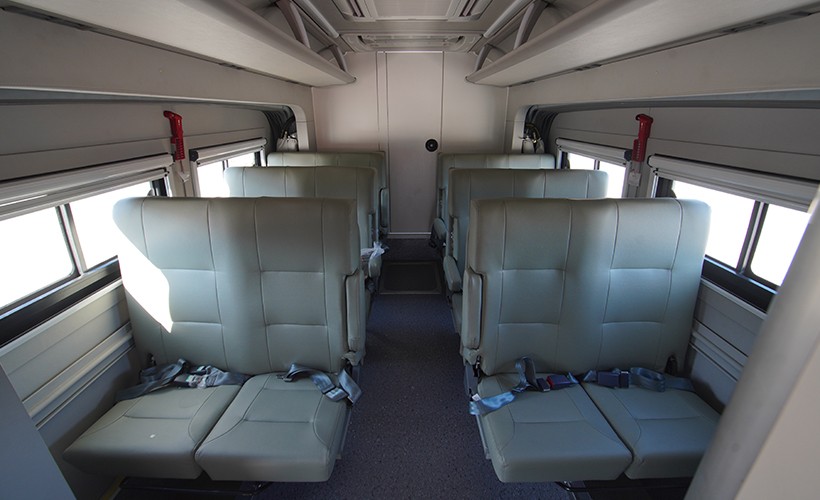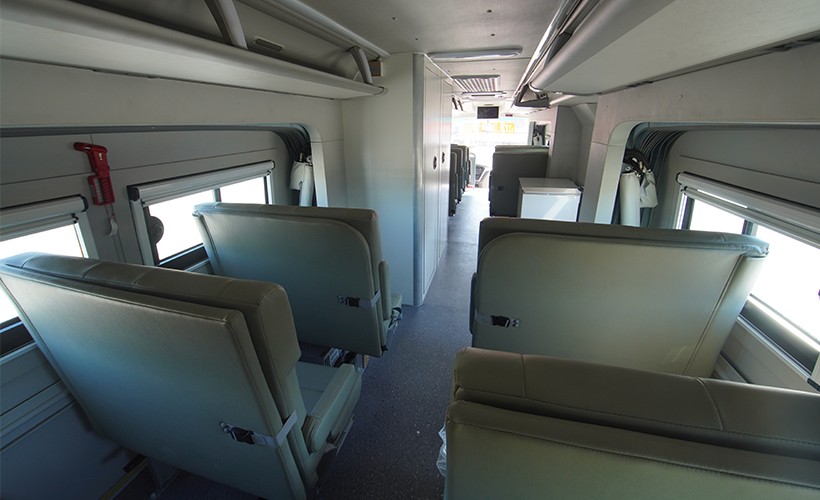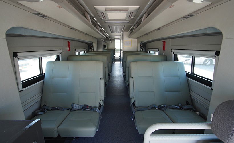 布置可折叠两用座椅,座位数共计29个(含驾驶员),展开后组成平整通铺,