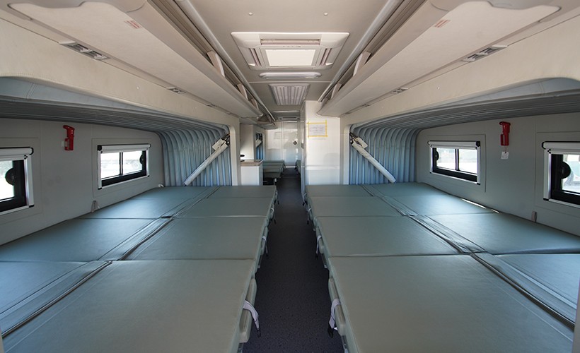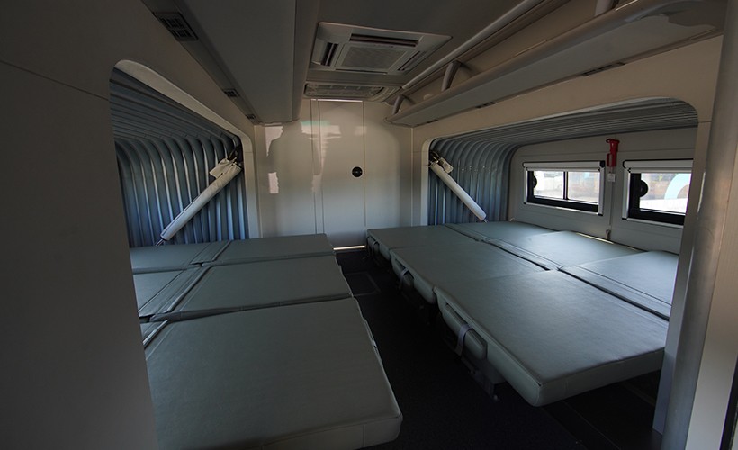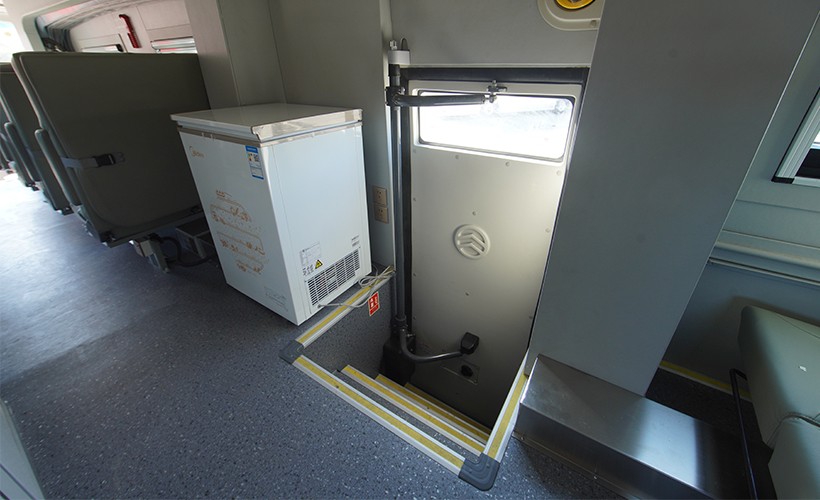 车厢尾部设置有单独隔间,可用于存放宿营用具,比如头枕、睡袋、行李箱等。宿营用具的数量和功能可以根据实际使用要求随车配置。