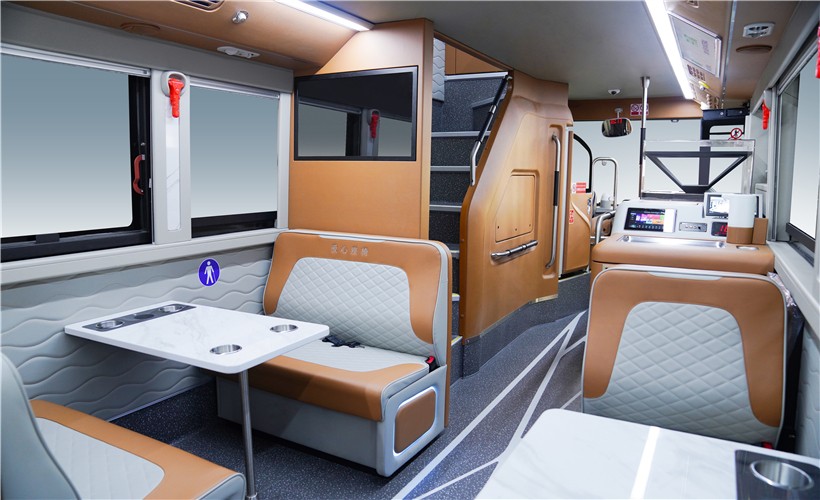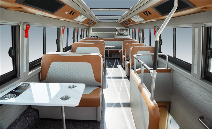 车内每一个能与乘客触碰处都做了软包处理,最大程度呵护乘客安全。进口木纹地板革,人体工学座椅,并配置USB充电接口,满足乘客充电需求;此外,车内专设无障碍乘车设施和轮椅区以及爱心专座,极大提升乘坐舒适体验;在车辆安全配置上, 360度环视系统,前向防撞、车道偏移预警系统,电动后视镜、胎压监测等一系列黑科技, 让车辆安全运行更有保障。