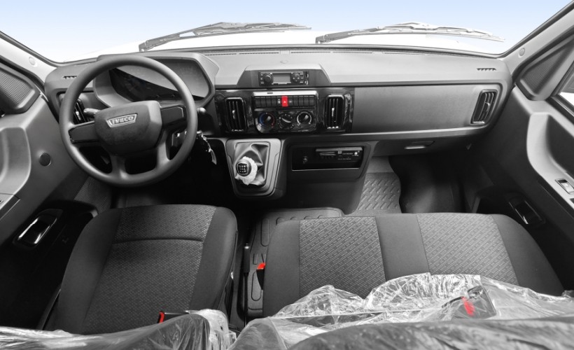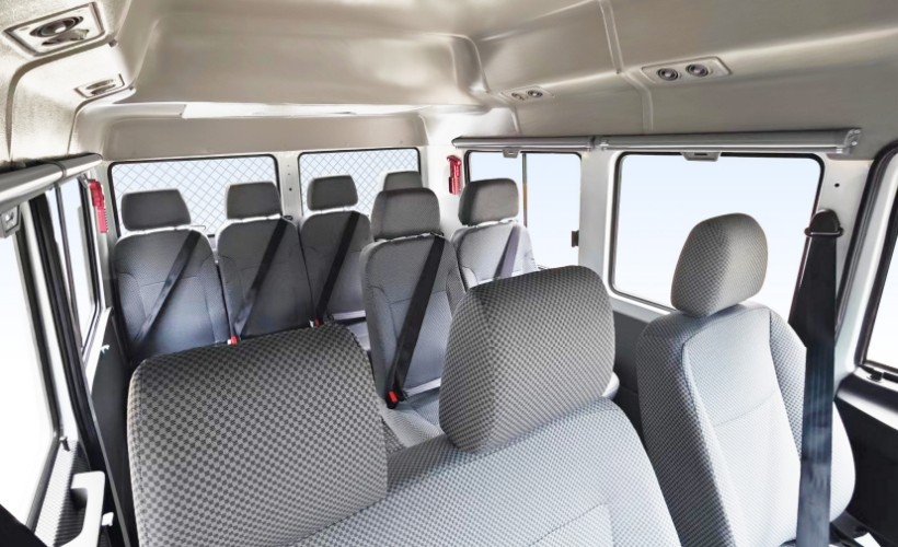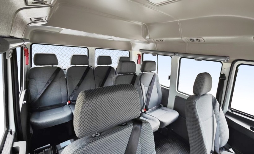 工程车在使用过程中的一项功能是随车运载相关工具和设备,分别在车顶设置有固定设备用的行李架和后爬梯,货箱区域四周设置围栏,增加车辆运载货物运载功能。后挡风玻璃装置金属网,避免行驶过程冲货物冲击驾乘区。货箱为对开门状态并配合登车踏板,最大限度的方便货物拿取。驾乘区域可以满足6-9人乘坐,顶部两侧设计多个空调出风口。侧窗为封闭式和推拉式配合设计,均配置有下拉式窗帘。