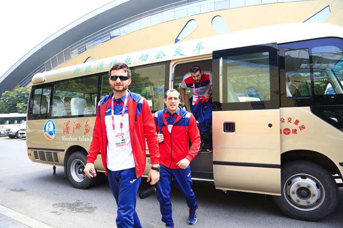 给运动员、裁判、官员等往返驻地酒店与赛事场馆之间提供便利的交通运输保障,是这两次赛事后勤保障的重要内容。为秉持环保节能,绿色办赛的宗旨,赛事上通勤车全部为纯电动,“噪音小、稳定舒适,符合绿色环保节能的赛事要求。”赛事组委会交通运输部联络员戴鸿琰说。担当这两次赛事通勤重任主角的是金旅考斯特纯电动豪华中巴。黄师傅有着二十多年的驾龄,但却是第一次驾驶纯电动,黄师傅满意地称赞道“第一次开纯电动挺激动的,没想到(纯电动)运行如此平稳,启动和加速都很快,而且没有味道和噪音,乘客坐起来也十分舒适。”金旅考斯特车型从它诞生之日起,一直是国内同级别车型的销量冠军,更凭借卓越的品质,从98年至今连续19年服务人大“两会”,被喻为“国宾车队的专用车”,并且长期服务国家及地方重要会议政务及活动的接待,广泛应用于商务、公务接待、城市通勤、中短途旅游用车以及城市社区、接驳线公交等市场。面对持续升温的新能源市场,“触电升级”的金旅纯电动考斯特依然延续着热销的局面。