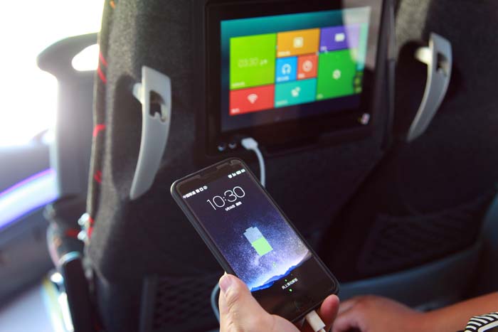 新锦程座椅采用的面料、配色、做工考究,与整车定位相得益彰。在座椅后部还选配有车载娱乐系统、WiFi及USB充电接口,在移动互联兴起的今天,这些配置在提供便利性的同时也丰富了乘客的旅途生活。新锦程类似的人性化配置还有快速换新风技术,可在3 min内实现车内一次换风,保持车内空气的新鲜;过道及行李架采用蓝色灯带,在夜间营造出温馨的车厢氛围,同时便于乘客拿取行李和上下车。