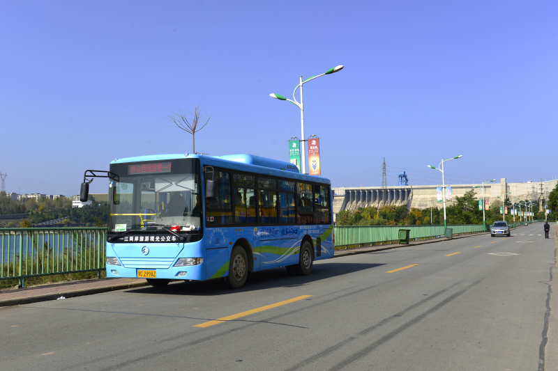 行驶在丹江口水库大坝前的厦门金旅纯电动公交车