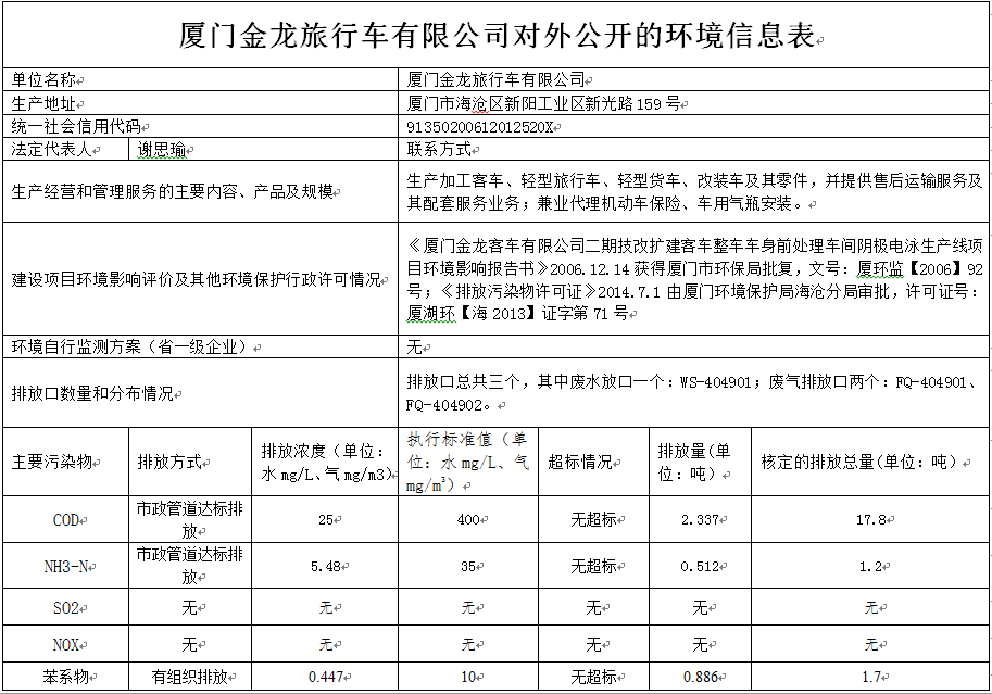 厦门金龙旅行车有限公司对外公开的环境信息表