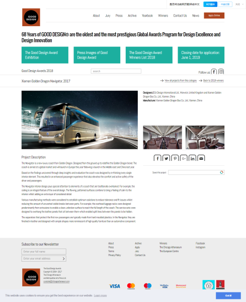 Design Awards优良设计奖名单公布,金旅客车的旗舰产品领航者名列其中,成为首个获得该奖项的中国客车产品。
