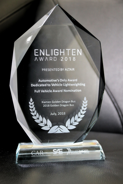 由全球57家汽车行业企业共同入围的2018 年 “Altair Enlighten Award” 奖,经过激烈角逐,金旅与宝马、通用等六家全球知名汽车企业的产品脱颖而出,金旅星辰车型揽获轻量化大奖。这是国际汽车行业内首个且唯一 一个专为表彰在车辆轻量化方面的创新而创立的奖项,同时这也是该奖项设立以来,首次有中国客车品牌入围最具分量的整车类奖项,金旅也成为该奖历史上唯一获此殊荣的客车企业。