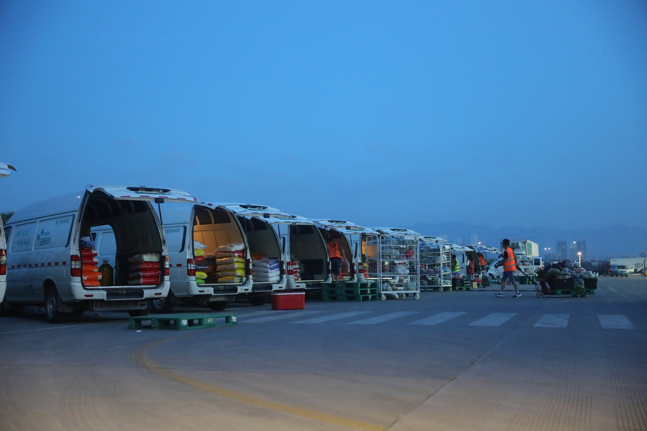 每天凌晨4点走进福州普洛斯物流园,可以看到一片繁忙景象。这里是福州美团生鲜货物的重要集散地,每天都将有三四十辆物流车驻扎这里,装上满满的货物,在凌晨六七点钟前将各种蔬果生鲜食物等送到各中小餐饮店。与此同时,在位于福州市仓山区三高路的麦德龙超市门口,也早已有四十多辆物流车准时报道,他们将在接下来的几个小时将蔬菜、冻品、生鲜、水果等货物按前一天的安排,准时送达各个机关事业单位食堂。