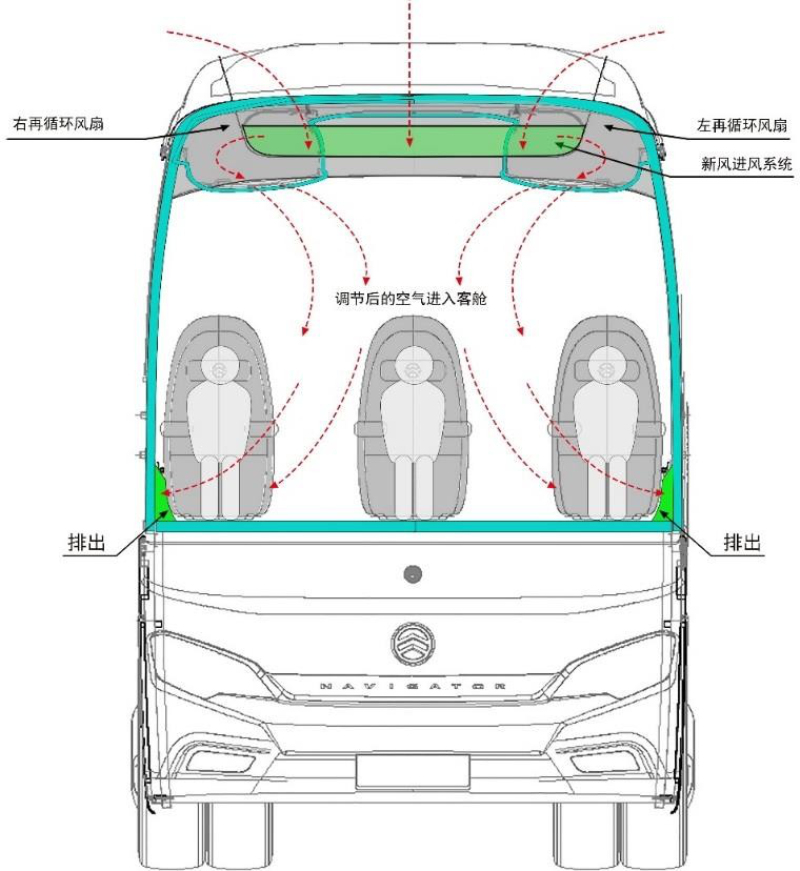另一方面,引入航空级新风装置以及风道左右两侧的再循环风扇,能够将车外的新鲜空气引入客舱,并将车内空气从客舱两侧底部的排气格栅排出,一旦开启,客舱新风量每小时将近1000立方米,空气每 5 到 6 分钟就会被完全更新一次,保证客舱里空气新鲜,可以有效降低病毒在客舱扩散蔓延的可能。
