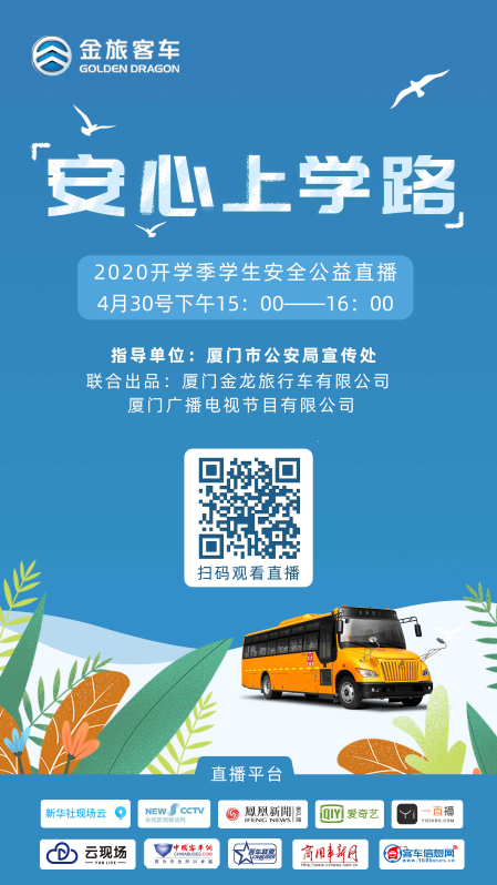 为了帮助学生们调节好心理和学习状态,2020年4月30日下午15:00,厦门金龙旅行车有限公司将携手厦门广播电视节目有限公司,在厦门市公安局宣传处的指导下,推出“安心上学路”——2020开学季学生安全公益直播,为广大学生家长解答居家出行的热点问题。