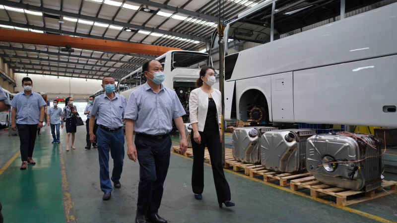 冀运集团总经理曹向欣(右)在金旅客车副总经理赖志艺(左)陪同下参观金旅生产车间
