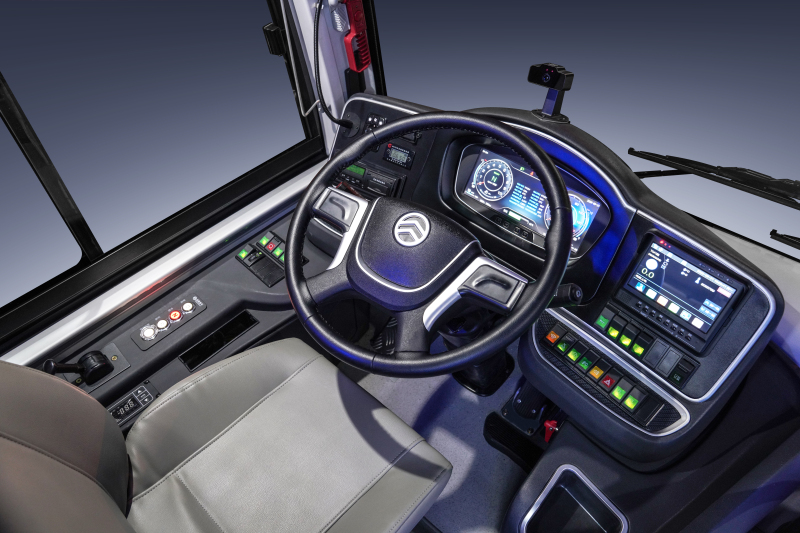 全数字仪表的12.3寸液晶显示屏上,可以同时显示大量的车辆信息和提醒装置,车门开启后大屏自动切换到车内监控,让驾驶员对于每一站乘客的上下车情况了如指掌。驾驶员还可以通过大屏实时了解到车辆及动力电池的各项信息。