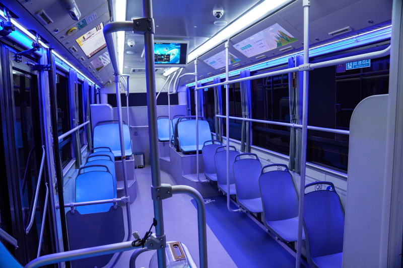 如何让人们爱上乘坐公交?首先要消除空间的压抑和拥挤感。北极星采用超短前悬、长轴距、全平地板设计方案,提升了车内的容量,8米8车型基本能达到10米5传统公交的载客量,不仅解决了公交潮汐现象带来的客流反差大问题,也改善了人们的日常乘坐空间。此外,通过增加两侧车窗的面积,让车内更加通透,减少了压抑感。车内可以自动亮起的蓝色氛围灯带,也是为了改善夜间公交车的乘坐体验。
