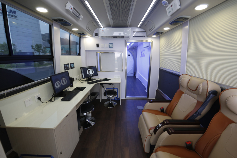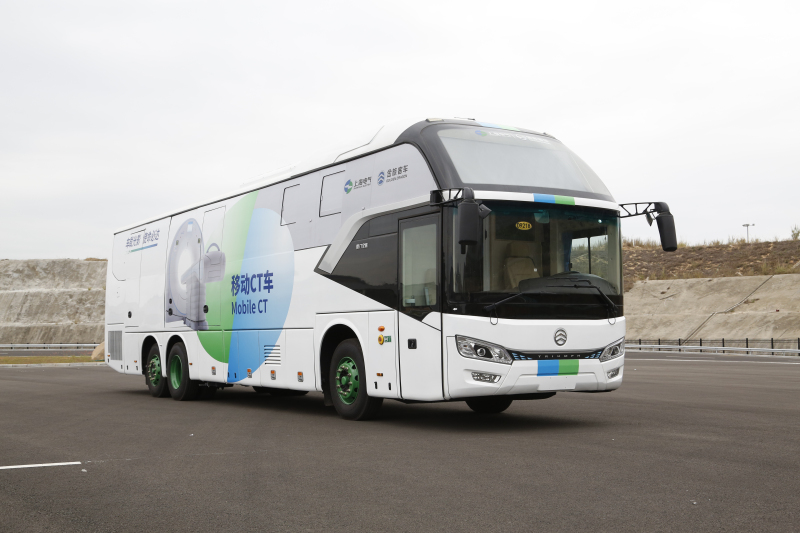 此次金旅推出的这款专属移动影像的重载医疗客车,整车总重达25吨以上,车长13.2米。采用金钢封闭环结构设计,底盘配备进口减震八气囊和液压平衡装置。CT机配备了独有的“金钢”行车锁止机构,锁定球管和旋转大部件,不受各种路况的颠簸和刹车时产生的前后冲撞扭力对CT设备带来的巨大伤害。为保障多场景的应用,整车配备了市电、锂电的双供电系统,AI人工智能和5G辅助诊断平台,为移动医学影像提供最优化解决方案。整车可装载16层到160层多款CT,还可加装DR或乳腺、超声和应急抢救设备。在疫情中,CT机房可变更为负压机房,为广大医疗机构提供多元化的重载型医疗客车。