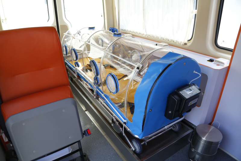 领特负压救护车的驾驶室与负压舱、负压舱与外界严格密封。负压舱相当于一个自动呼吸装置,安装有控制空气流动的负压系统,负压仓通过高效空气过滤器平衡气流压力,形成一个固定的空气流场区域。负压设备具备消毒灭活系统及空气过滤功能,通过特殊设计的定向排风系统,经专门的通道再由高效空气过滤器过滤后排放到外界,过滤的效率可以达到99.99%,排出的气体几乎不会有任何污染,最大限度地减少了医患人员交叉感染的可能,也使排到舱外的空气保持洁净安全。以此同时,车上的病患也可以得到医用氧气的供给,医护人员也可以从舱外观察患者的生命体征。