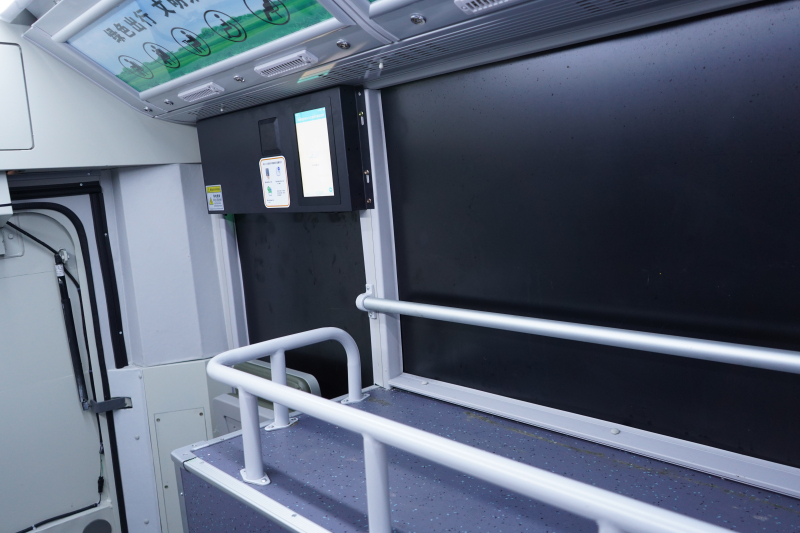 考虑到宁海公交今后可能需要承担更大的物流量,金旅北极星后排空间安装了一道门,留出大约10立方米的可变空间,平时可站立乘客,物流专用时可以用来装货物。同时,车辆还加装了一些智能化设备,通过大屏幕内置的读卡器能感应到包裹袋上的二维码,包裹一上车,后台就会有它们的路径,保障物流信息的完整,实现智慧物流运输。得益于物联感应、智能网联等科技手段,金旅北极星集聚高品质、绿色、智能优势,打开了无限外延拓展功能,实现绿色公交与智能物流深度融合。