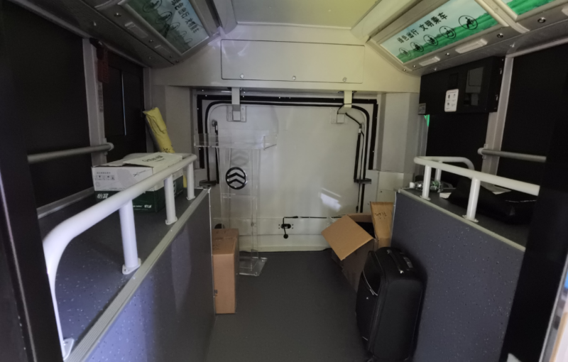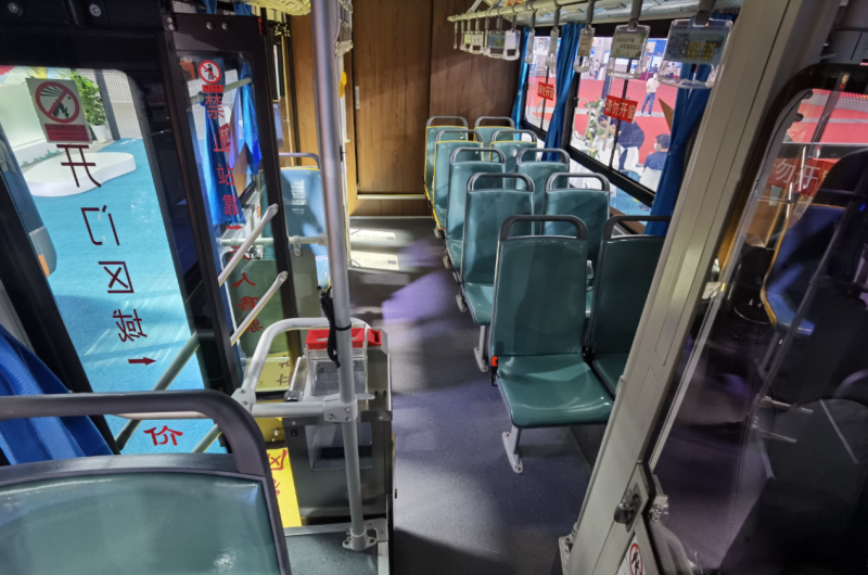 车厢中部设有11个乘客座,前部副驾驶1个正向乘客座,整体为典型的城乡公交车双排座椅布局形式。二级踏步,安装32寸LCD导乘屏、上下客门迎宾灯、USB充电口等设施,并预留有上下车刷卡线缆。