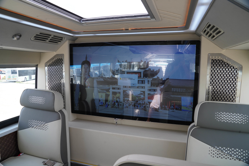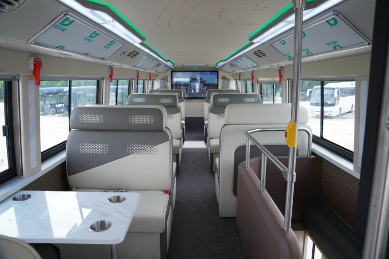 车内每一个能与乘客触碰处都做了软包处理,最大程度呵护乘客安全。进口木纹地板革,人体工学高靠背豪华软座,并配置USB充电接口,满足乘客充电需求。此外,到站提醒及景区风光介绍的高清大屏,带杯架独立办公桌,豪华造型中顶板,软包缝线工艺侧板,多彩氛围灯,车内专设无障碍乘车设施和轮椅区以及爱心专座,极大提升乘坐舒适体验。