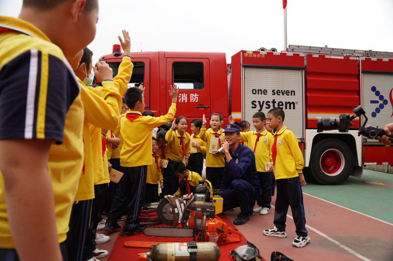 新阳消防救援站的消防员为同学们展示消防器材
