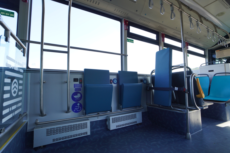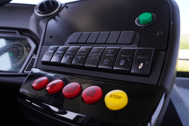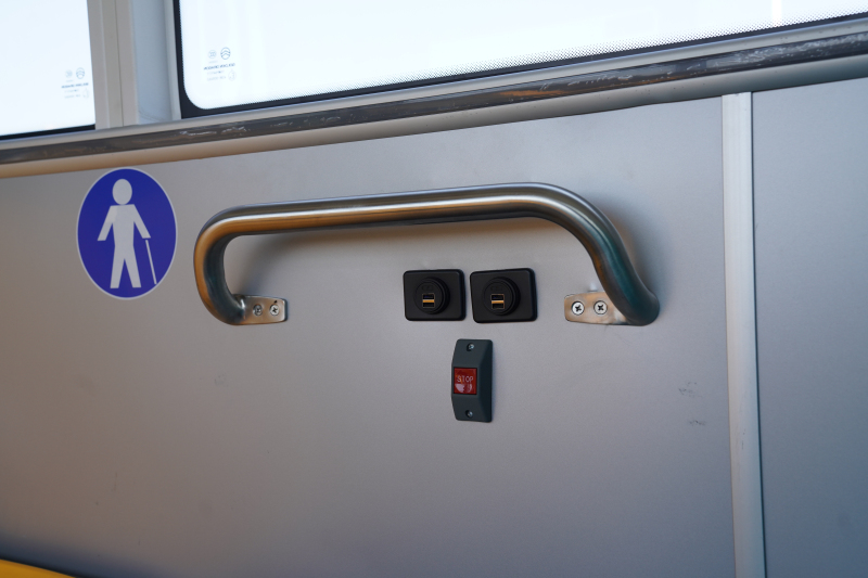 在这里也要提到一些亮点的细节设计,这款车设有专门的残疾车和婴儿车停放区,并且设置了相应的下车呼唤按键,便于驾驶员提前做好准备。不仅如此,还在每一排座椅及扶手处,专门设置了一个“STOP”下车按键,按键高度也充分考虑到不同身高的乘客需求,这样在客流量大的时候,可以让驾驶员提前获知下车乘客的请求,提升了运行效率和乘坐体验。