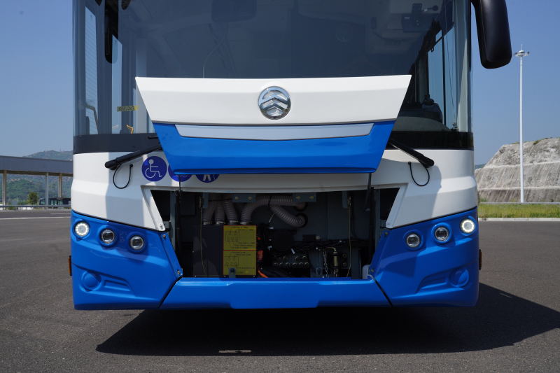 这辆金旅18米城市公交车型采用的是分体式车灯设计,其优势是后期的维修成本更低,维修便利性和通用性更好。此外,它的前围采用全敞开式设计,并由上掀式改为平开式,方便车辆日常检修工作。