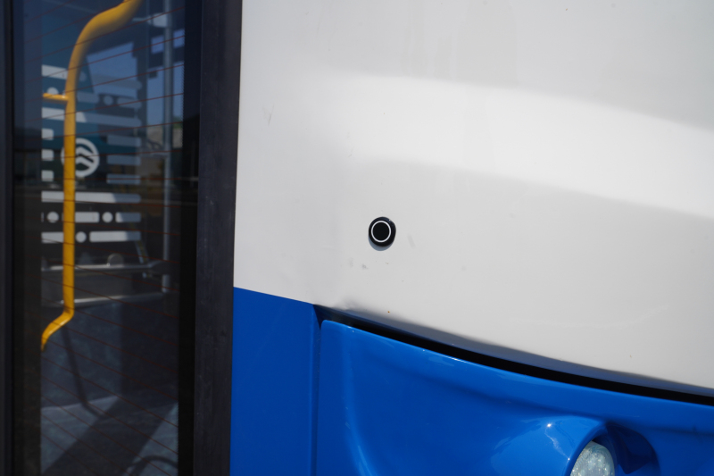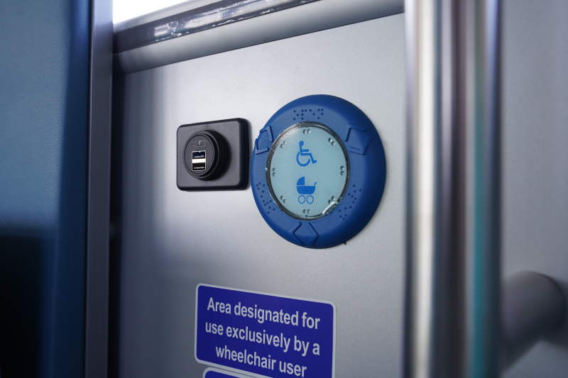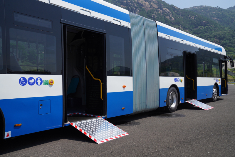 其次,考虑到残疾人等乘客的特殊需求,特别在第二门和第三门安装了两个残疾车坡板,同时车内外设置了多处圆形带灯光的轮椅请求按钮,这些乘客在上下车时可以通过按动请求按钮来提示驾驶员,在放下坡板之后,通过带侧跪功能的ECAS车身升降系统,可以帮助残疾人等特殊乘客更方便更高效地上下车。
