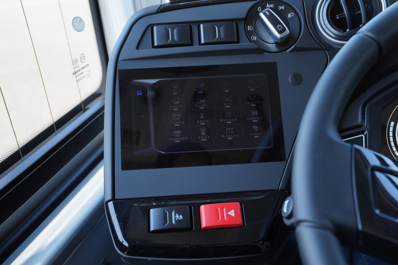 此外,环抱式驾驶区的各种按键分区非常清晰。左侧为非常用按键,采用了一块液晶触摸屏,节省布置空间,改善了操作体验;根据使用习惯,将车门开关等使用频率高的按键都布置在右侧;由于电动车的车辆信息更加丰富,这款车采用了全液晶仪表,驾驶员可以随时了解车辆的实时状态。