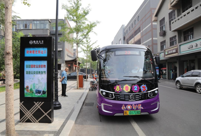 2022年8月18日,临汾公交22路“8023”主题微循环浪漫巴士在当地投入运营,自此临汾成为山西省首家投放微循环公交车的城市。该条公交线路上的车辆均采用金旅星辰纯电动客车,该车型造型新颖、颜色靓丽,带着浓郁的“时尚浪漫”气息,已成为城市一道亮丽的风景线。