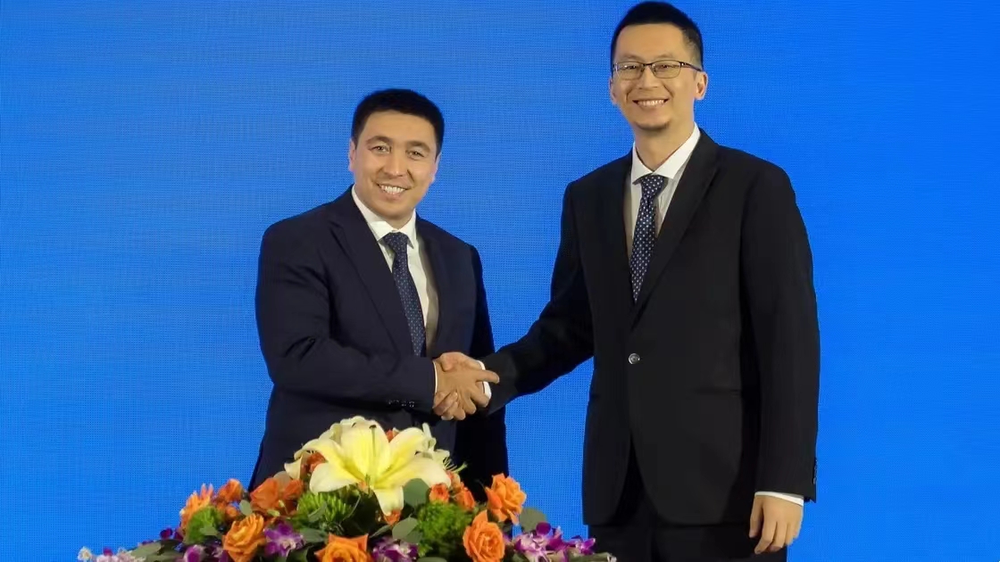 (HTA总经理Adilbek Gayev(左)与金旅海外销售公司总经理安敏(右)签订战略合作协议)