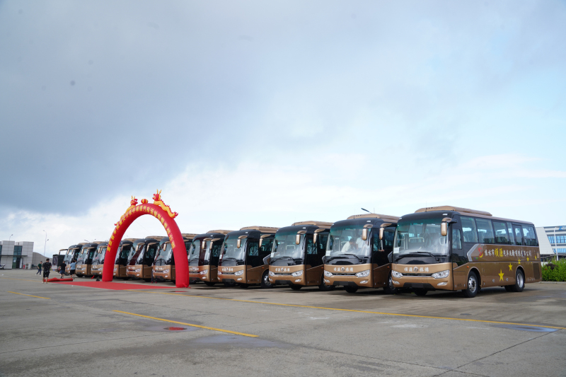 7月3日上午,厦门金龙旅行车有限公司(以下简称“金旅”)龙池生产基地正举行着一场交接车仪式,天气时雨时晴,但丝毫不影响接车客人喜悦兴奋的心情。仪式现场喜气洋洋,16辆车头戴着大红花的金旅客车正式交付桂林市顺源汽车运输有限责任公司(以下简称“顺源汽运”)。该批车辆由12辆金旅锦程中巴和4辆金旅凯歌大巴组成,是金旅针对旅游市场高端化、品质化的最新出行需求,应用全新科技和领先工艺打造的拳头产品,备受旅游市场青睐。