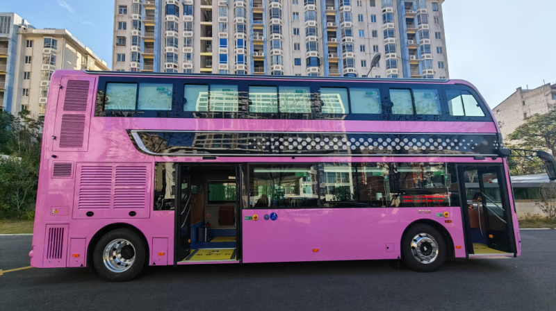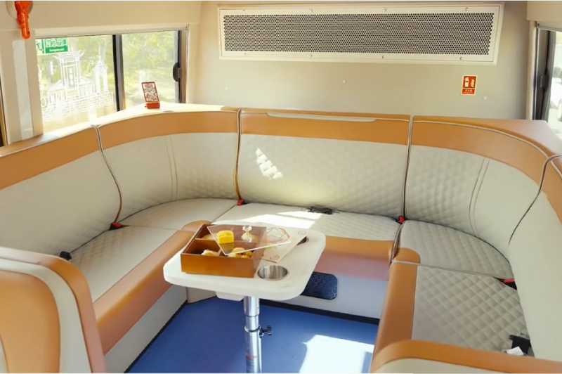 粉嫩的“双层观光巴士”,拥有全景天窗、KTV影音系统、氛围灯及车身灯带等多项豪华配置。一层车内顶棚印有泉州特色景点老君岩和东西塔的图案,二层的窗户玻璃里刻有十幅世遗景点图,整车处处体现泉州经典印记。