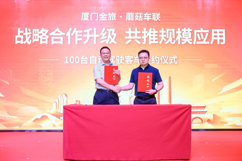 为进一步推动自动驾驶技术研发及运营推广,会上,金旅客车与蘑菇车联举行100辆自动驾驶产品签约仪式。