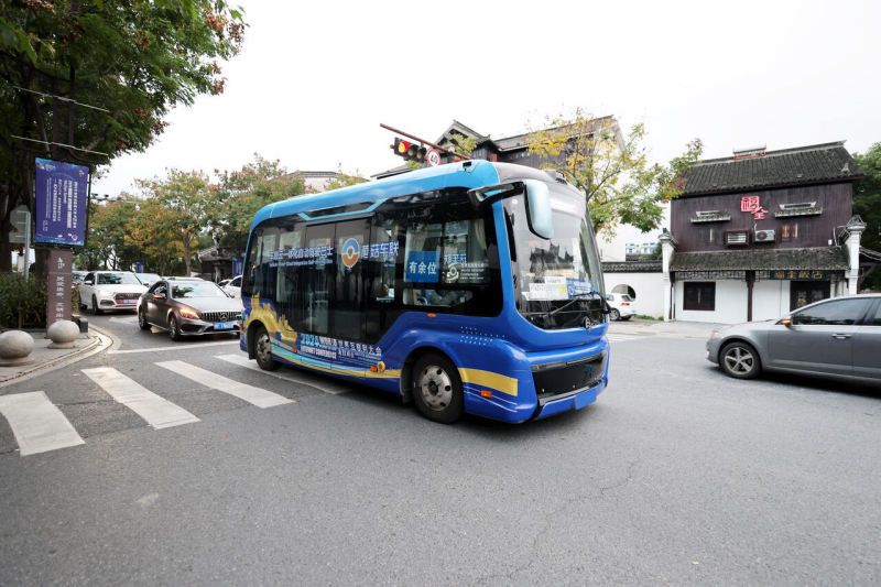如果说,展会上揭示了未来世界的奇妙景象,那展会之外的智慧服务则让我们确信,未来已在当下。这几天,车身贴上峰会蓝色主设计图的无人驾驶接驳车已陆续进驻,在景区两条接驳线上投入使用。而金旅的新一代无人驾驶网红巴士“驰睿”再次担当重任,以其卓越的性能和先进的技术,成为了大会的指定服务接驳用车,在黄金水岸大酒店、乌镇景区P2停车场(“互联网之光”博览中心)之间往返。这是继2019年金旅“星辰”无人驾驶巴士助力乌镇开通全球首条城市开放道路“5G自动微公交”示范线路以后,金旅的无人驾驶产品再次亮相乌镇街头。