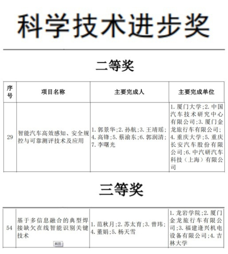 近日,2023年度福建省科学技术奖获奖名单正式揭晓,金旅客车再获两项大奖。其中,由金旅客车联合厦门大学、中国汽车技术研究中心有限公司等机构共同完成的“智能汽车高效感知、安全规控与可靠测评技术及应用”项目荣获科学技术进步奖二等奖;由金旅客车联合龙岩学院、吉林大学等合作完成的“基于多信息融合的典型焊接缺欠在线智能识别关键技术”荣获科学技术进步奖三等奖。这是福建省对金旅在智能网联汽车领域技术创新和智能制造领域工艺升级的重要肯定,标志着金旅客车在自动驾驶核心技术研发方面取得突破性进展,也是金旅在全力打造智慧工厂,助推企业从“制造”转型升级为“智造”的生动注解。