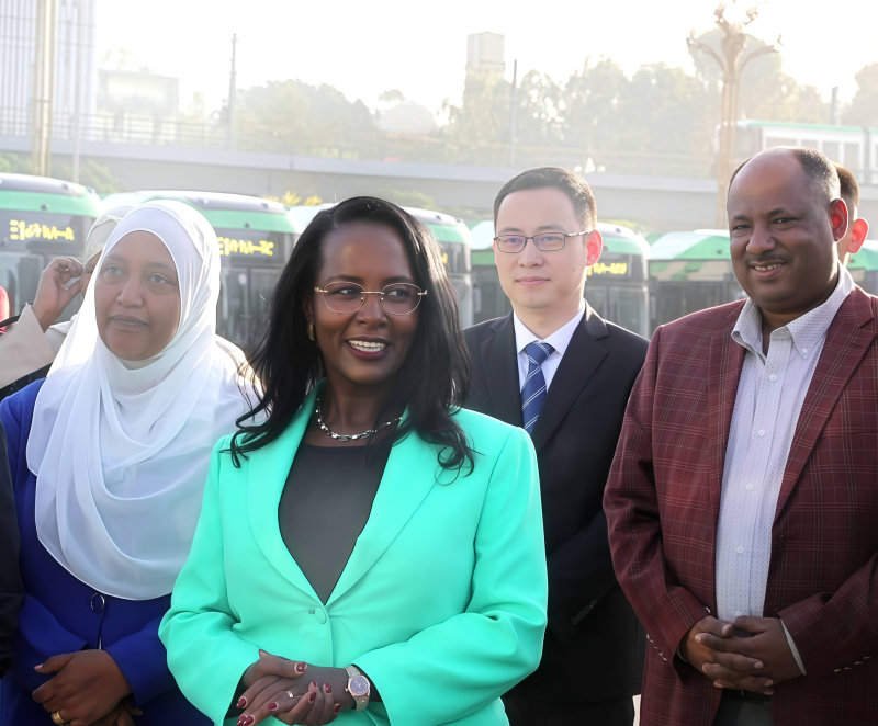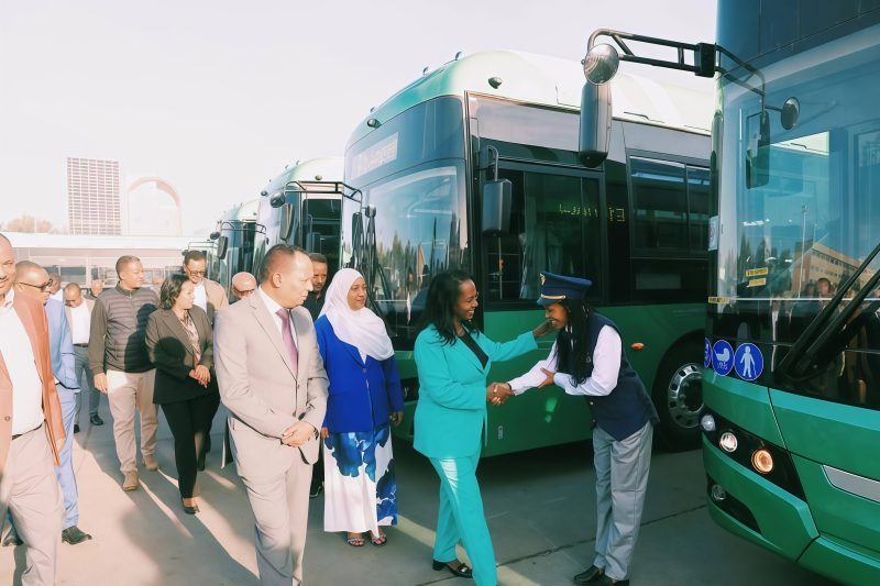 本次交付的100辆12米纯电动公交车以KD散件形式在埃塞本地组装,搭载宁德时代磷酸铁锂电池及中国标准充电设施,完美适配埃塞电网标准。亚的斯亚贝巴市长阿达内彻·阿贝贝(Adanech Abebe)在仪式上指出,交通发展始终是市政建设的重中之重。“这些电动公交不仅将缓解市民出行压力,更是我们践行绿色发展的具体行动。”她特别提到,半年前投放的150辆金旅纯电动轻型车已累计减少碳排放1.2万吨,相当于种植了6万棵成年树木。这也证明金旅客车三电系统已通过亚的斯亚贝巴复杂路况与气候的严格考验,验证了其可靠性。