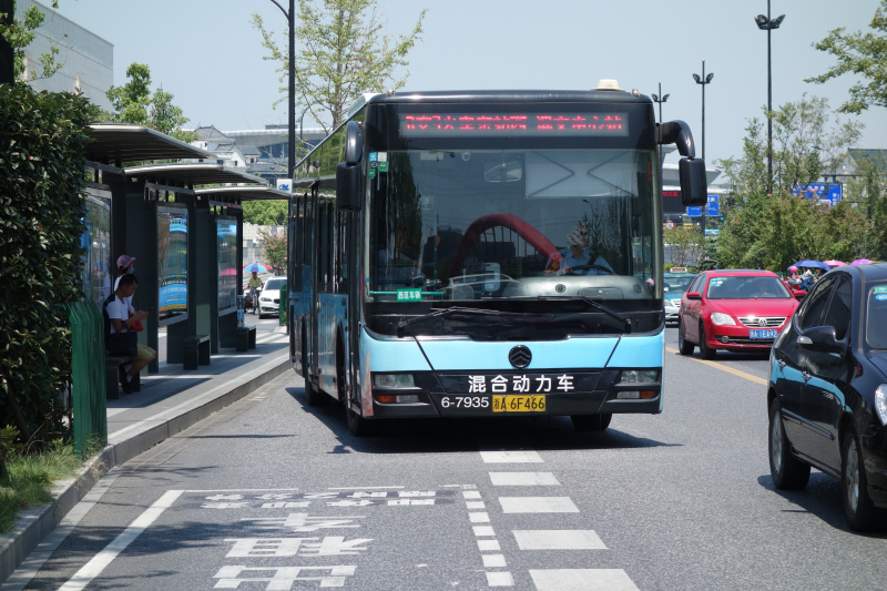 杭州街头的金旅混合动力公交车