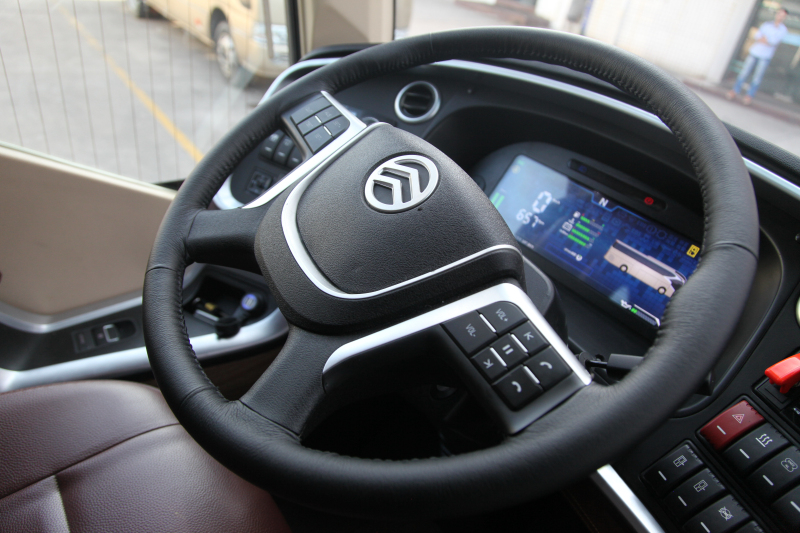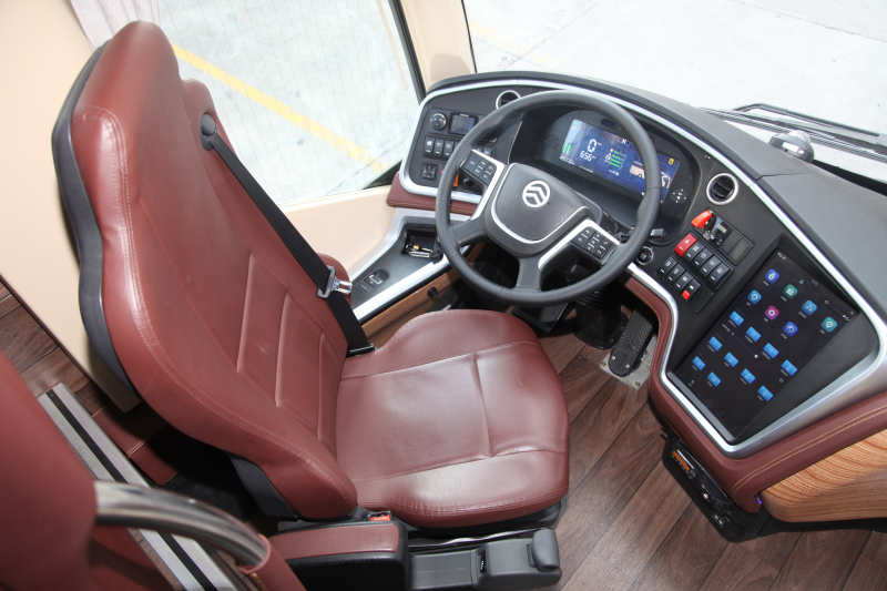 作为试驾者,我最先关注的是驾驶区设计。当看到一部已经旋转好45°等待迎接驾驶者进入的座椅时,估计很多驾驶者会如我一样被这种贴心的设计所打动。由于客车以乘客满意度为主要衡量指标,国内客车产品的设计者会把更多精力放在乘客区,普遍存在着对驾驶区关注度不够的问题。但事实上,驾驶员的工作状态对一辆客车的安全性、经济性和舒适性有着至关重要的影响。从领航者身上我们看到了国内客车在驾驶区设计理念上的改变,除了一款舒适可旋转的空气悬浮座椅,AMT变速器、一键启动装置、电动车窗及后视镜调节、电动遮阳帘、电子驻车制动等自动化配置,都会让驾驶者像驾驶一辆家用车那样轻松。