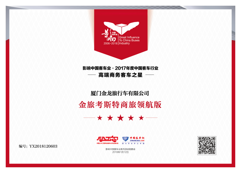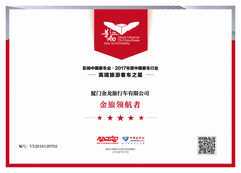 金旅客车强摘“2017年度高端旅游客车之星”,让引领豪华标杆的领航者实至名归。