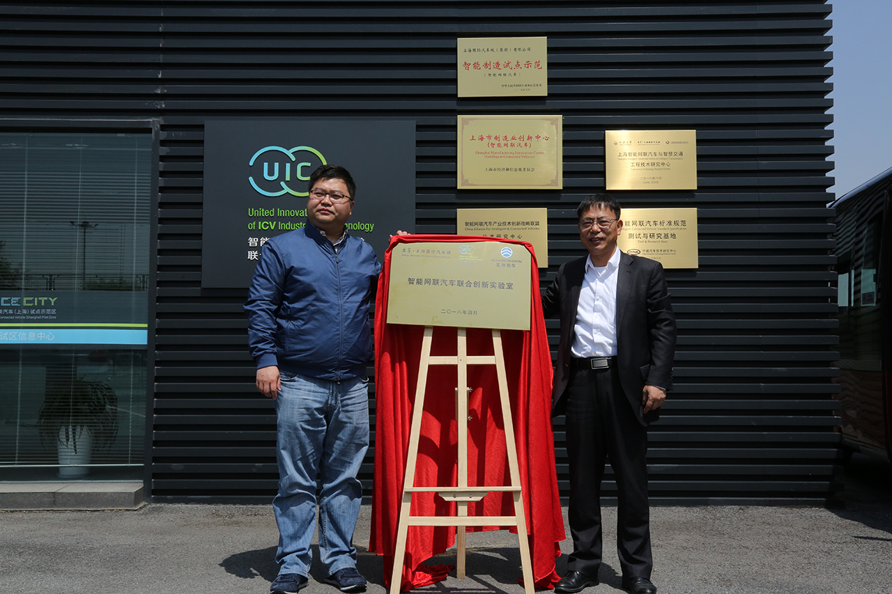 厦门金旅董事长吴文彬(右)与上海国际汽车城(集团)有限公司总经理助理陈海林(左)共同揭牌“智能网联汽车联合创新实验室”