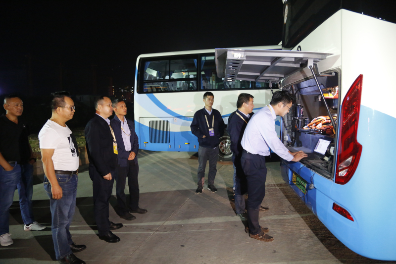 3天会议期间,金旅售后服务中心抽调十余名维修技术骨干人员,同配套企业组成二十余人服务团队,成立服务保障指挥部和五个服务保障组,至第一现场服务保障。指挥部通过监控平台实时查看所有参会车辆的位置、数据、报警信息等,对每台车辆运行状态了如指掌,及时协调派工。车辆保障采用“集中-分散-集中”服务模式,即早上出车时,服务人员集中晨检车辆,所有车辆顺利发班;运行过程中,各服务保障组全程跟车押运,确保车辆安全正常运行;晚上收班时再对车辆系统部件点检。