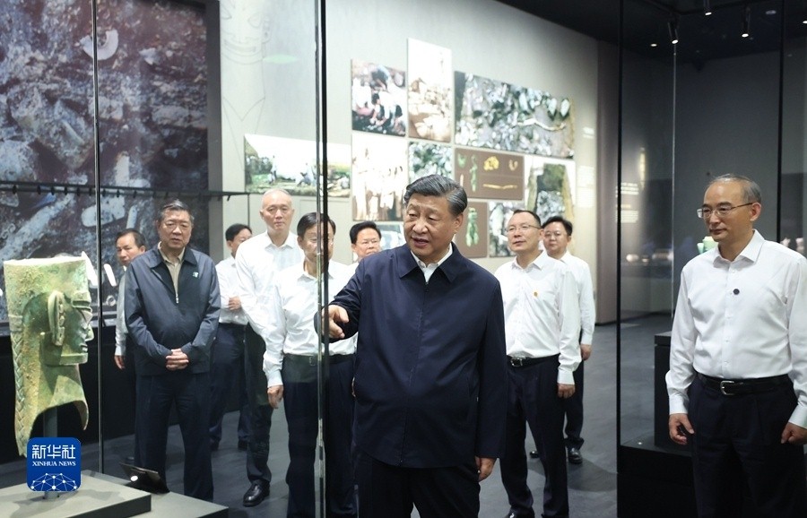位于德阳市广汉市西北鸭子河南岸的三星堆遗址,代表了数千年前的古蜀文明面貌和发展水平,是同时期长江流域文化内涵最丰富、面积最大的都城遗址。26日下午,习近平来到三星堆博物馆新馆,参观“世纪逐梦”、“巍然王都”、“天地人神”等展陈,了解三星堆遗址发掘历程和古蜀文明成果。在三星堆博物馆文物保护与修复馆,习近平走进文保修复工作区,仔细察看文物保护修复工作流程细节和最新技术,同现场工作人员亲切交流。习近平指出,三星堆遗址考古成果在世界上是叫得响的,展现了四千多年前的文明成果,为中华文明多元一体、古蜀文明与中原文明相互影响等提供了更为有力的考古实证。文物保护修复是一项长期任务,要加大国家支持力度,加强人才队伍建设,发扬严谨细致的工匠精神,一件一件来,久久为功,做出更大成绩。习近平代表党中央,对三星堆博物馆新馆的落成使用表示热烈祝贺,向广大考古工作者表示衷心感谢和崇高敬意!